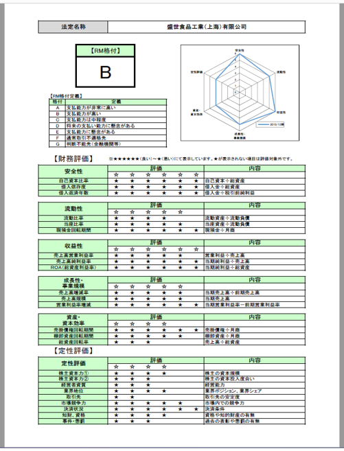 このレポートにはリスクモンスター社独自の与信管理指標である「RM格付」が付与されており、国内企業と同じ基準で調査対象企業の与信判定ができます。
