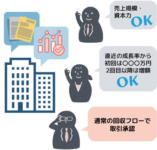 最終決裁権限は社長であっても、初回取引限度額は経理・会計部門での判断になる場合もあります。 - 与信審査のフロー化