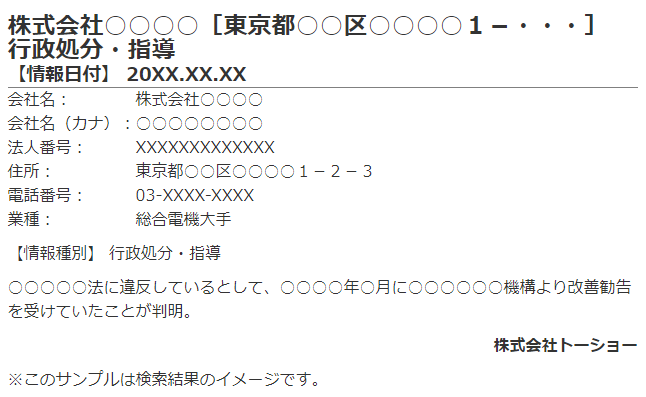 このデータベースは、企業の行政処分・違法行為・訴訟・債権譲渡登記設定・競売・赤字・倒産など信用に関わる情報だけを収録しています。